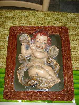 Igualmente estoy encantada con el resultado a pesar de la guerra que me ha dado, yo misma me agobio haciendo cosas dificiles, le hice una por una las plumas !!loca yo!!!, con la ayuda inestimable de mi madre hizo el delantal bajo mis patrones, mi hijo Sergio le ha hecho el collar, y yo pinte esas extrellitas con lunares para darle mayor realismo, en fin! que no os voy a dar más explicaciones, este es el regalo que a medio hacer y en el rincón de las cosas inconclusas se enamoró mi prima Victoria y me hizo prometer que sería para ella. !!para ella es!!